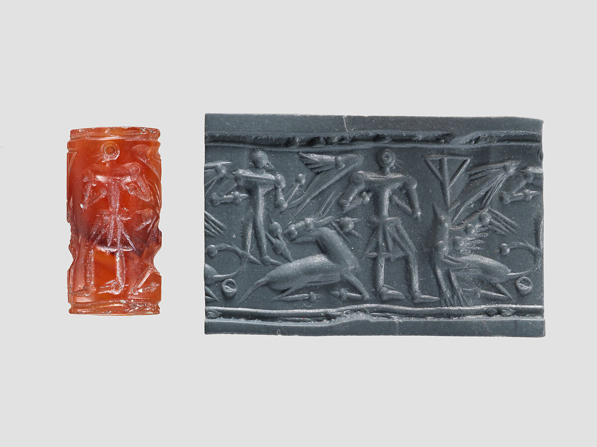 - Title: Cylinder seal and modern impression: man, goat, griffin, nude figure, and "impaled triangle"