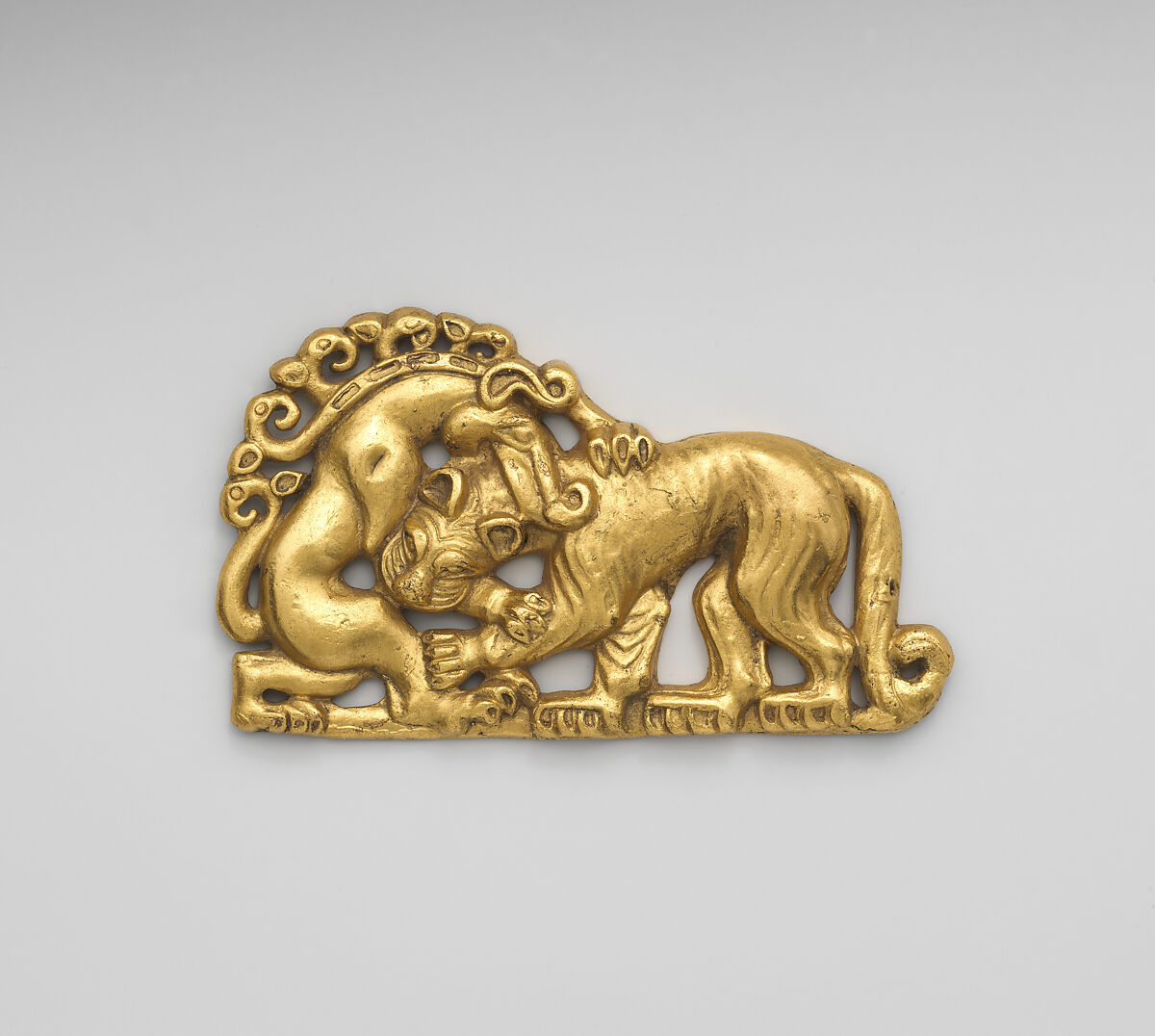 This modern electrotype is a copy of a gold plaque in the Hermitage Museum, St. Petersburg. The original was part of the Siberian collection of Peter the Great of Russia (r. 1682-1725), who commissioned the first Russian archaeological excavations. The Siberian Collection of Peter the Great contains gold artefacts from the Scythian and Sarmatian nomadic cultures of Eurasia. This ornament corresponds to the left side of a pair of symmetrical belt buckles depicting a combat between a tiger and a horned monster. The complex representation of the fantastic beast is characteristic of later “animal style” art in which animal contests are one of the most popular motifs.