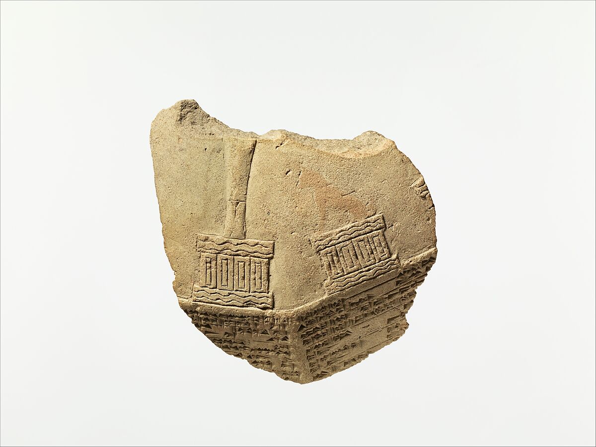 This object is a fragment of an unusual clay prism and bears both a cuneiform text and images. It was originally twelve-sided and, in fact, three other fragments are known (one in the Metropolitan. 86.11.309 and two in the Harvard Semitic Museum). Above the cuneiform inscription which reads from left to right are parts of three images of divine symbols: an altar with a stylus on top, representing the god Nabu, the god of writing; an altar that appears originally to have had the image of a dog on top of it, standing for Gula, the goddess of healing; and traces of the left side of an altar. The presence of the symbols on the domed top of the object suggest that it may have be a kudurru-like text. Kudurrus are a distinctive group of Babylonian monuments (narus) once thought to be boundary markers placed in fields. In fact they are more likely to have been placed in temples, where their contents were preserved and sanctified. The monuments, usually made in stone, carry inscriptions describing grants of land, often from the king to a high official. Around the text are placed divine symbols, which act to protect and guarantee the gift. The text on this prism records a set of royal land grants made to members of prominent Babylonian families.