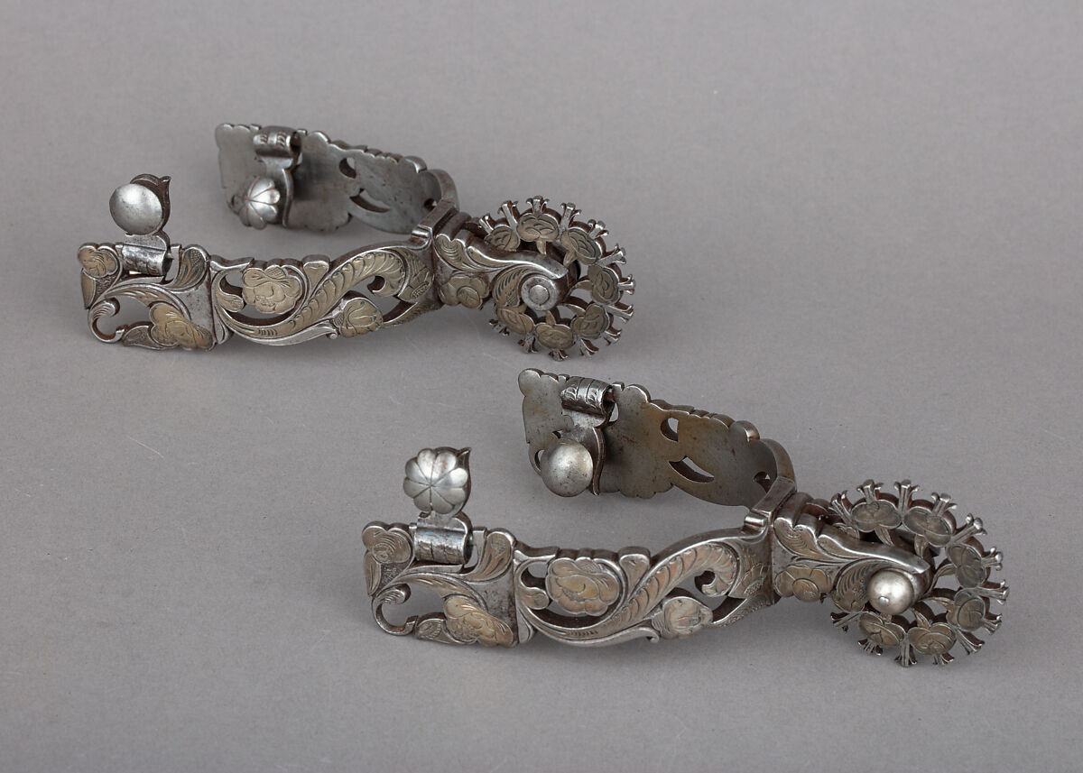 These spurs, made for a Mexican charro (a Mexican cowboy), are decorated with foliage and roses, pierced, chiseled, and inlaid with silver.