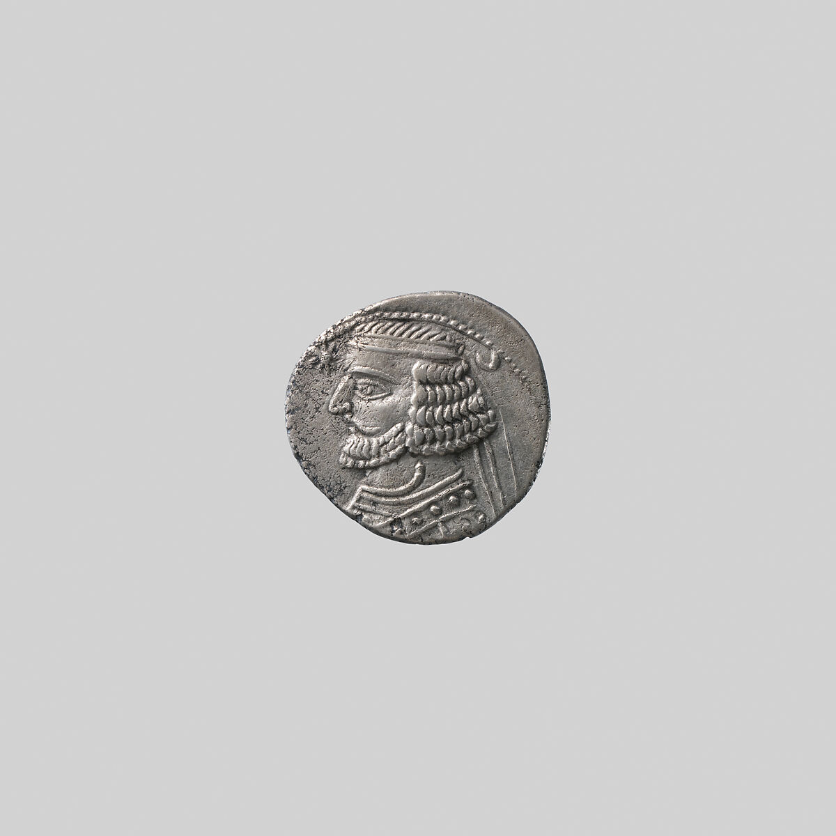 This coin was struck by the Parthian king Orodes II (reigned ca. 57–38 B.C.). The king on the obverse is probably meant to be Orodes himself, wearing a diadem as a symbol of victory. The identity of the figure on the reverse is unknown; perhaps it is an idealized Parthian king, depicted as an archer. The figure of the archer is quite stylized, in contrast to earlier Parthian coins where it is more closely modeled on the image of Apollo that appears on early Seleucid coins. The head of Orodes on the obverse also exhibits some stylization, such as in the schematic rendering of the hair and beard.