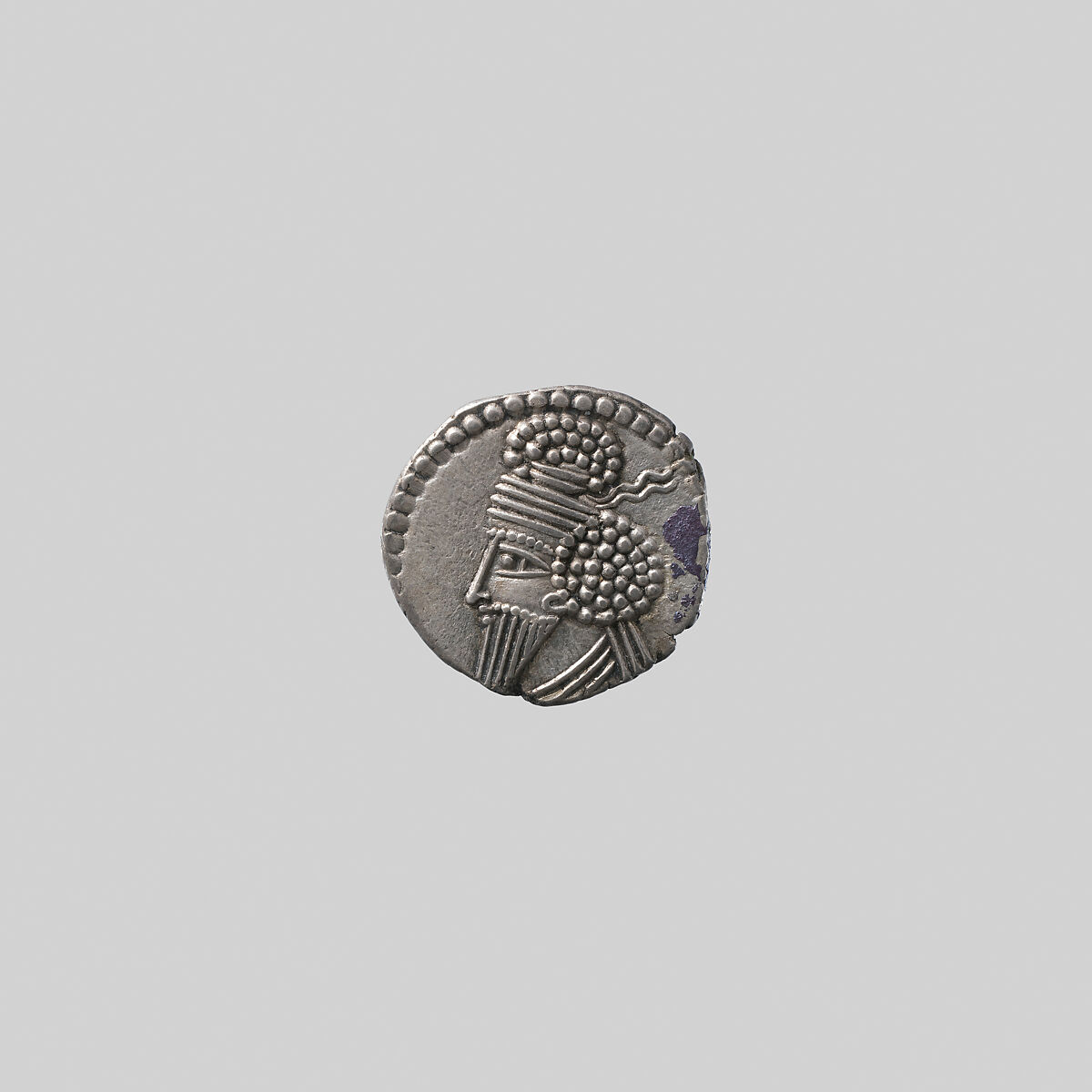The inscription on the reverse is almost entirely illegible, as are most inscriptions on Parthian coins after ca. A.D. 100. If interpreted correctly, this inscription names the first ruler of the empire Arsaces I (reigned ca. 247–217 B.C.), rather than the current ruler. It may be a reference to the dynasty founded by Arsaces, or perhaps the seated archer is meant to represent him. It is also possible that all Parthian kings were called ‘Arsaces’ as a title or throne name.