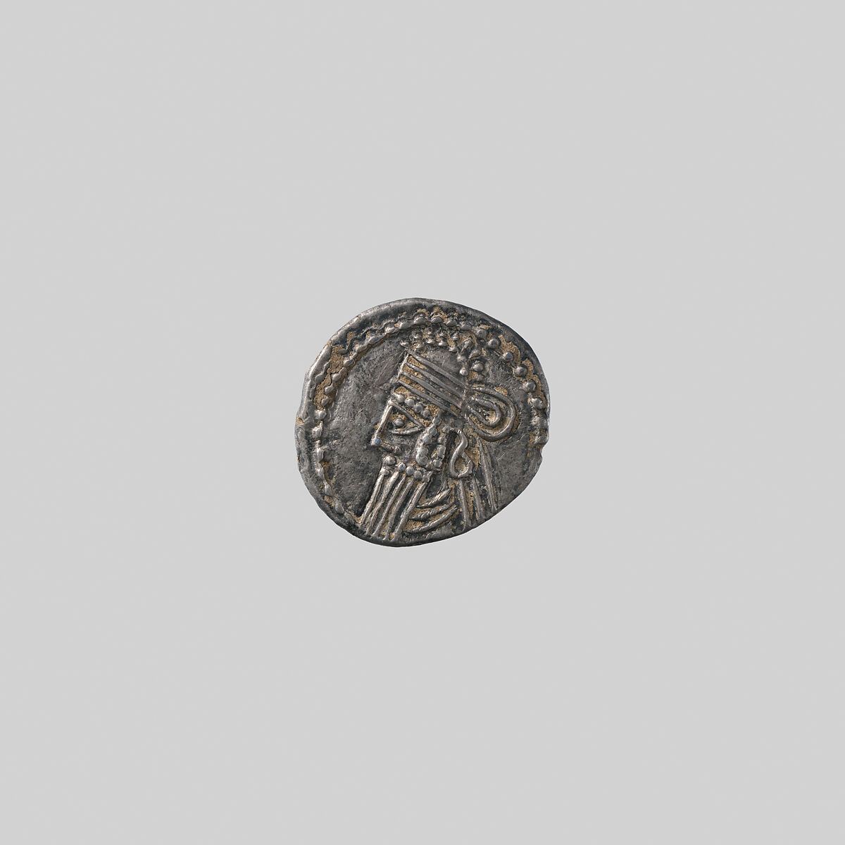 This coin was struck by the Parthian king Vologases III (reigned ca. A.D. 147–191). The king on the obverse is probably meant to be Vologases himself, wearing a diadem as a symbol of victory and a tiara, the main type of Parthian royal crown. The identity of the figure on the reverse is unknown; perhaps it is an idealized Parthian king, depicted as an archer. The head of Vologases the obverse exhibits significant stylization, such as in the schematic rendering of the eye and beard.