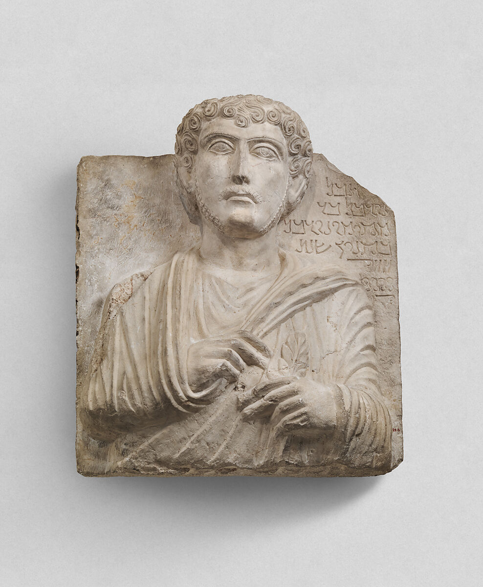 The relief depicts the upper body of a bearded man dressed in a Greek garment known as a himation, which wraps around his right arm like a sling, holding a small leafy branch in his left hand. His upper eyelids are modeled, and carved circles mark the iris of each eye. The thin eyebrows and slightly narrowed, deep-set eyes give the deceased an expressive gaze, which does not meet the viewer’s but extends far into the distance. His short hair is depicted as a mass of snail-shaped curls that cover his head like a cap, with the hairline symmetrically arranged in the shape of a widow’s peak. His beard barely covers his jawline, its sparseness perhaps meant to suggest his youth. He stands in front of a blank background on which an inscription in Palmyrene Aramaic, visible to the right of his head, records his name, lineage, and the month and year of his death. The months of the Palmyrene calendar were based on the earlier Babylonian calendar, while the years were reckoned according to the Seleucid era, which began in 312 B.C.