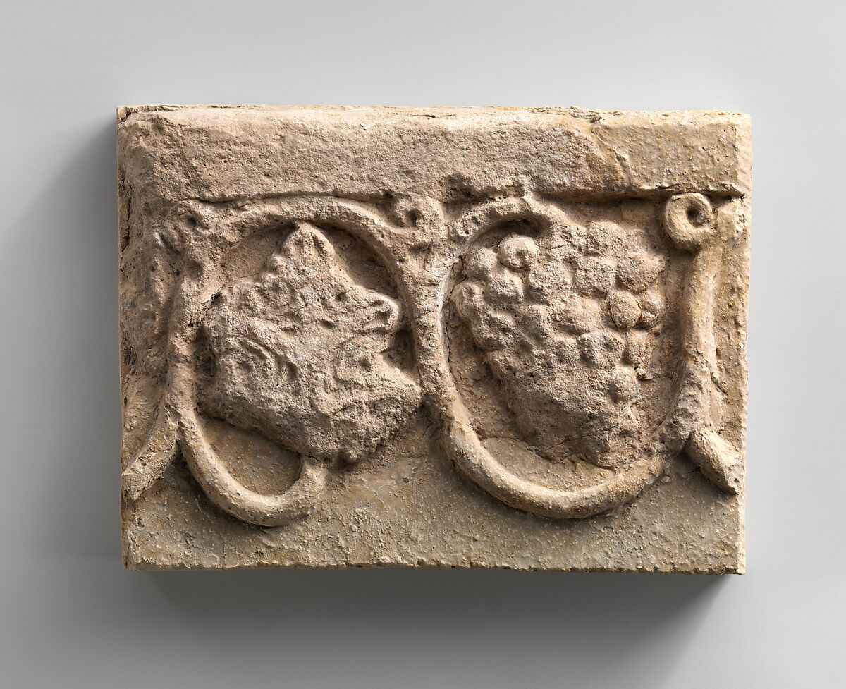 Stucco reliefs were commonly used to decorate the iwans and reception halls of elite Sasanian houses. Many examples were found in excavated houses in the Ctesiphon area including this relief from Ma’aridh IV consisting of a grapevine design. The use of molds to make stuccos allowed for the creation of large scale repetitive patterns such as floral and vegetal motifs. Vine patterns probably formed the borders around the edges of larger patterns.