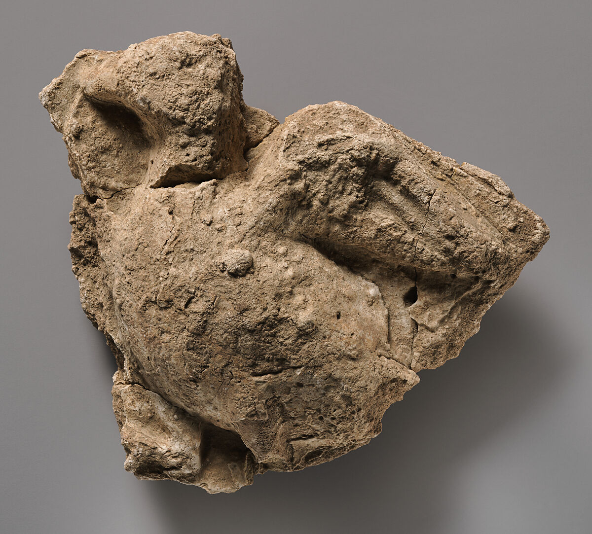 The Sasanian houses at Ma’aridh in the Ctesiphon area were decorated with stucco reliefs of dancers, animals and foliage. This fragment depicts a bird in flight with the wing extending back from the body. The bird would have been part of a larger scene covering a wall or archway.