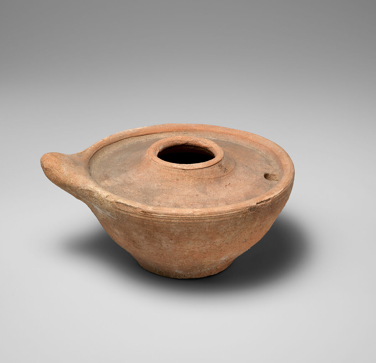 Small lamps, like this example made from unglazed ceramic, would have been filled with oil and had a small wick threaded through the hole near the rim. The tab handle is used for picking up or moving the lamp. The lamp was excavated from a house at the site of Ma’aridh II in the Ctesiphon area. A very similar example was found at the nearby Taq-I Kisra palace (32.150.170).