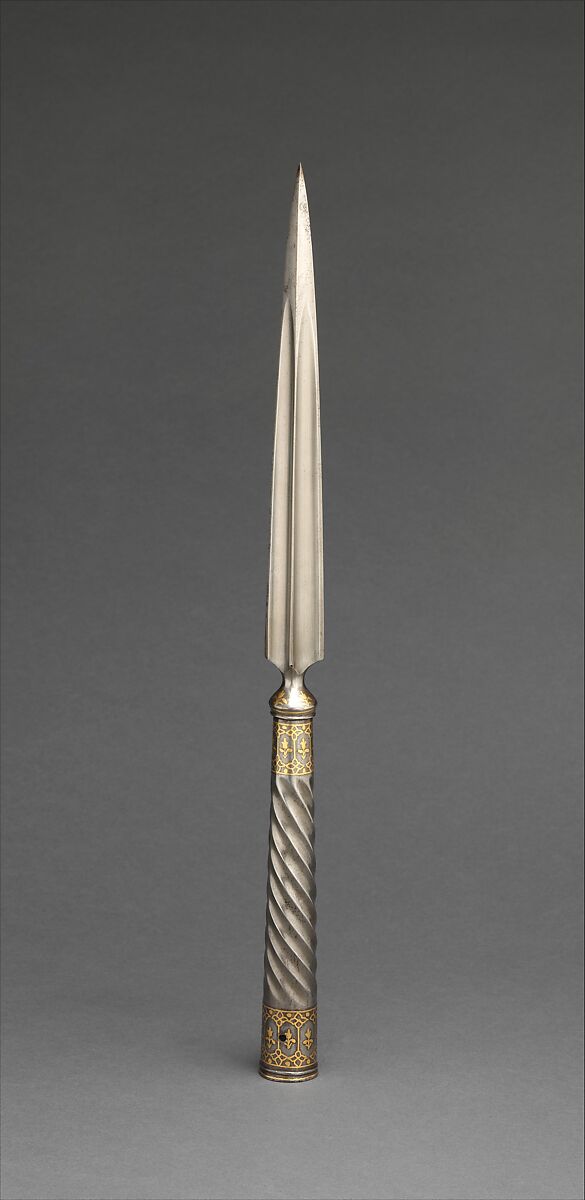 Spears were a versatile tool for royal hunting expeditions, as demonstrated by their depiction in the paintings nearby. They were used while either on foot or on horseback, and could be thrust or thrown. Some spears were made of a single piece of iron or steel; others comprised a wooden shaft and steel spear head. Inlaid with gold, this example was intended to be both lethal and beautiful.