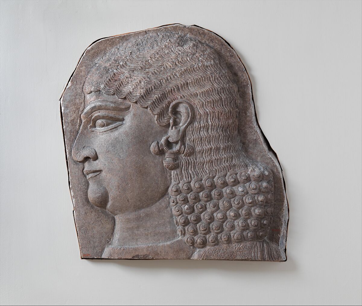 This relief fragment comes from the main palace at Khorsabad and shows the head of a beardless male figure, probably a eunuch. Eunuchs played a major role in the Assyrian court and palace administration, and are frequently depicted in the reliefs that decorated the palace. This head is thought to come from a larger scene showing a group of beardless courtiers carrying vessels and furniture for a banquet or celebration. Although they are depicted serving the king, the figures are richly dressed, indicating their high status within the Assyrian court. The head in this fragment wears the elaborate hairstyle typical for an Assyrian courtier, as well as a large earring with three projecting studs, one of several styles seen in the reliefs. Comparable earrings have been discovered in the tombs of royal women at Nimrud, where they are made of gold and set with colorful stones such as banded agate.