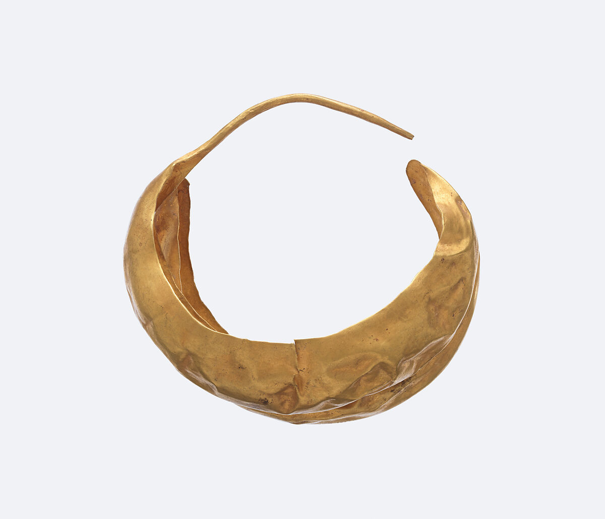 The earrings are typical of those from the royal tombs. Made from two pieces of gold sheet, each is shaped like a hollow crescent or open boat with raised ends. The crescents were shaped over a bitumen core. Woolley identified these objects as earrings because they were regularly found in pairs beside the skull. He suggested that the pin could have passed through the lobe of the ear. Another possibility, however, is that they hung beside the ear but were attached to a headdress.