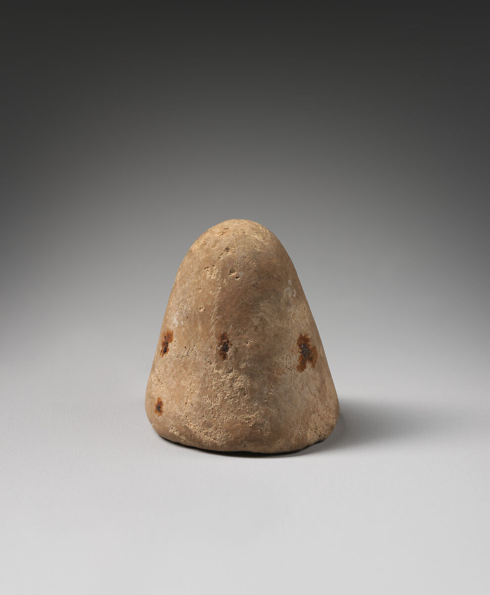 Objects such as this one can present problems of interpretation when they are not preserved as part of a set. This conical ceramic token is identified as a chessman, but it could just as well be a backgammon piece, or some sort of token not related to board games at all. Chess, whose origin is traditionally attributed to India, and backgammon are both attested in Iran by the late Sasanian period.