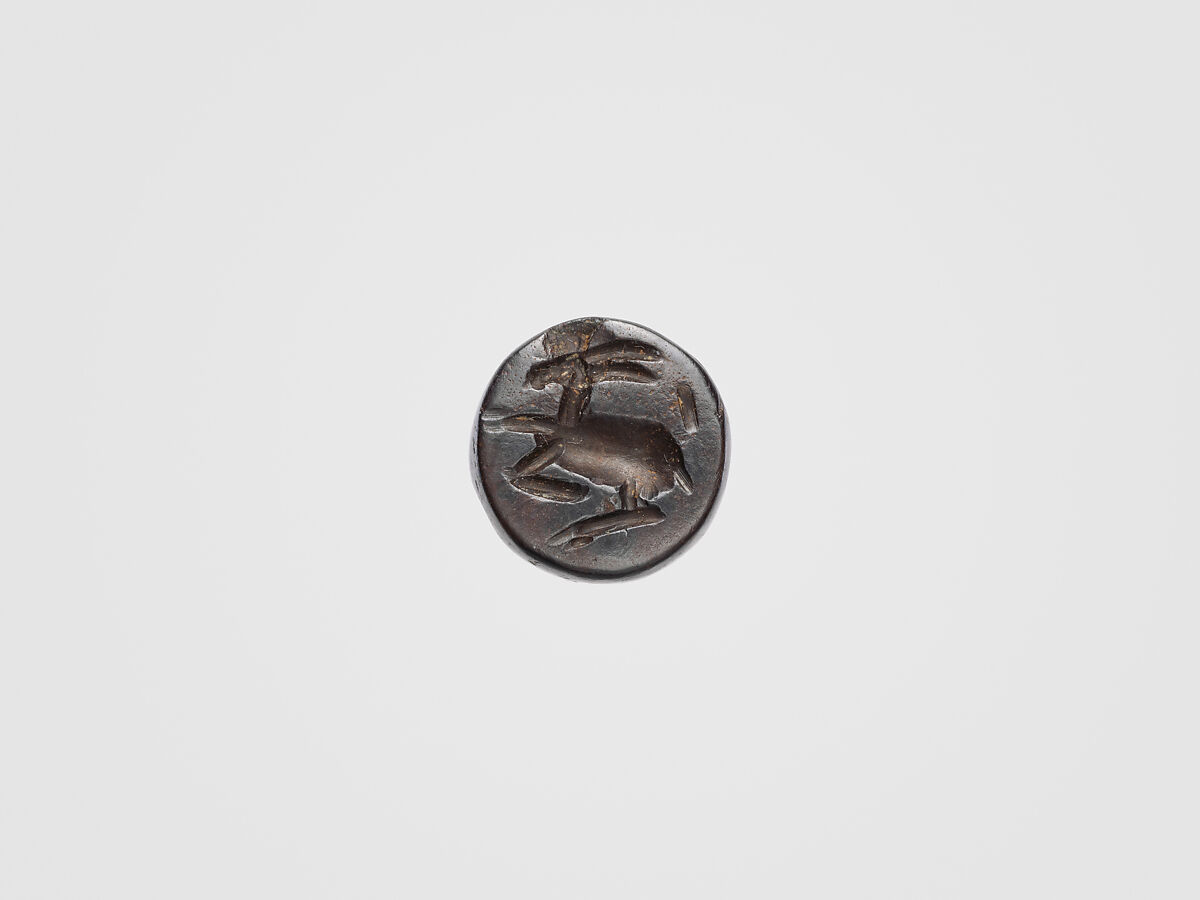 Stamp seals were used in antiquity as marks of ownership and badges of status. This seal is hemispheroid in shape and is pierced so that it could be suspended and perhaps worn. On its flattened side, a recumbent, horned animal is depicted. The image is carved into the surface of the stone and appears in relief when the seal is pressed into clay.