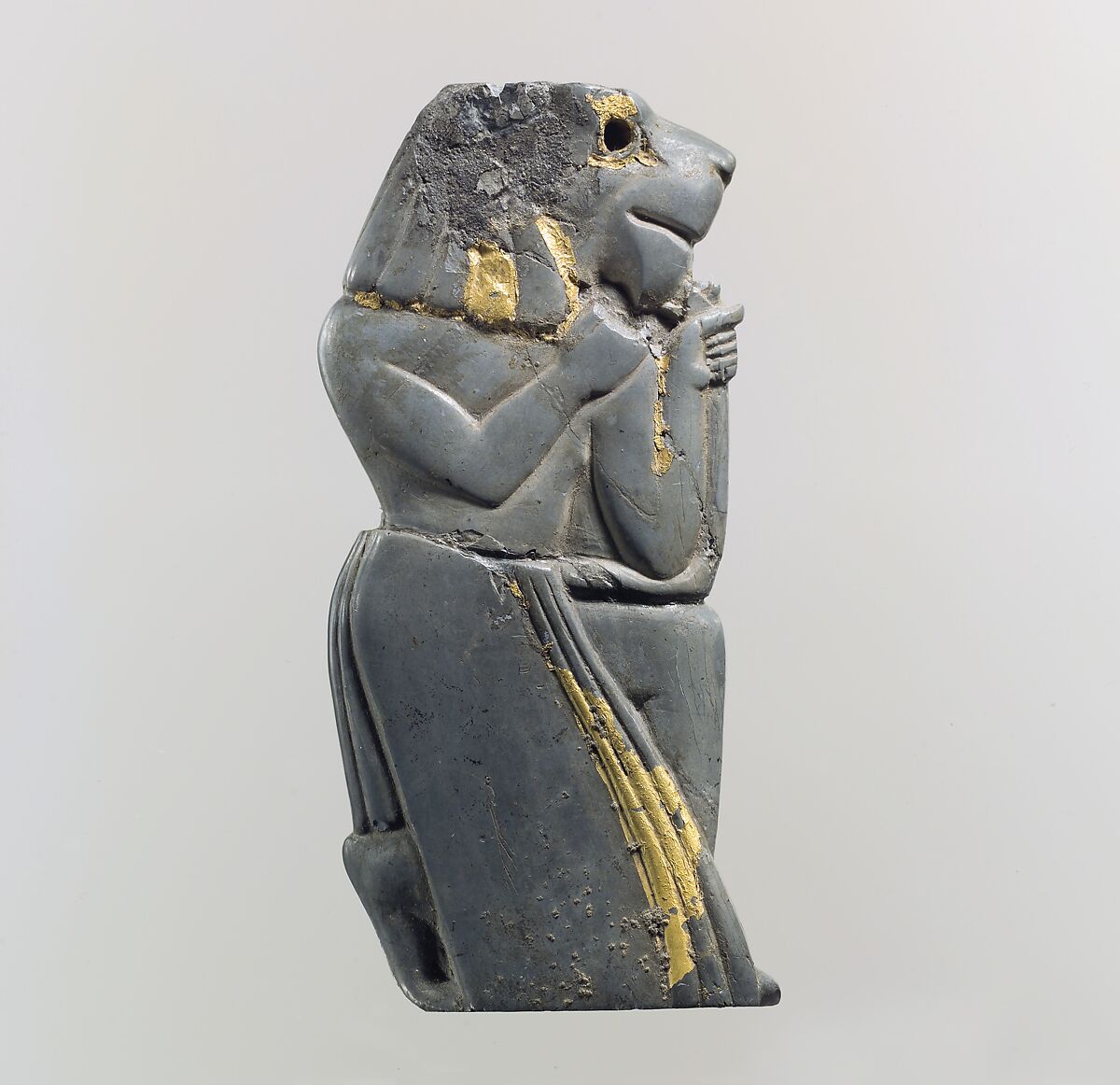 The plaque has attachment holes at top and bottom, and probably was used to decorate a piece of furniture. Its overall gray color indicates that the object was exposed to considerable heat, perhaps during the destruction of the palace. Gilding is preserved not only on areas such as the border of the long open kilt, the mane, and the eyes, but along the edges of the mane and the inner line of the bent left arm, which may indicate that much of the surface was originally covered in gold leaf. The pupil of the eye was hollowed to receive an inlay, now missing. The mane is stylized to resemble a wig rather than tufts of animal fur. The left arm is bent at the elbow, with the fist held to the chest, while the right grasps a flowering plant stem. The clearly human torso shows no indication of gender. The lower body is depicted kneeling, with one leg exposed and the other covered by the long kilt. A nearly identical plaque, in which the figure faces left, is also in the Metropolitan Museum’s collection (36.70.14, 37.413.4). Both plaques have been reconstructed from two halves, broken at the waist; in this example, the upper half is numbered 37.143.3 and the lower half 36.70.15.