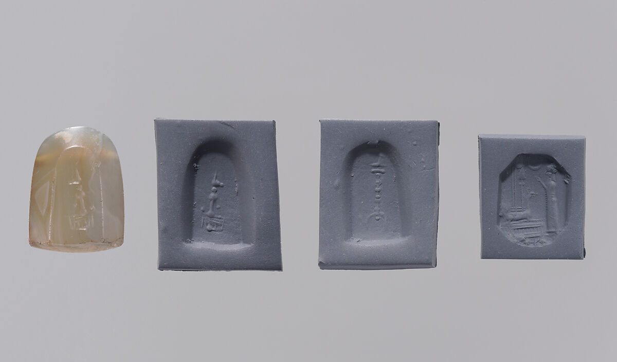 - Title: Stamp seal (octagonal pyramid) with cultic scene and divine symbols