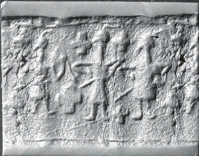 This cylinder seal is made of steatite. The modern impression of the seal is shown so that the entire design can be seen. The image features a procession of three stylized human figures with straight arms and legs, pointed heads, and possibly horns. They may be carrying weapons. Two crosses are in the background. The carving of the seal is shallow.