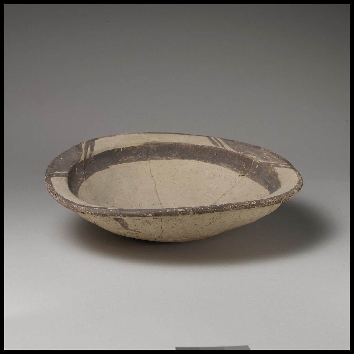 The usual pottery found in Ubaid graves at the southern Mesopotamian site of Eridu consisted of an upright jar, a dish or a plate like this one, and a cup lying inside the dish. They were placed in the corner of mud-brick coffins near the right foot of an outstretched body. Although the paint designs on Ubaid pottery do vary, this plate conforms to a general type consisting of two concentric rings close to or at the rim. Three equally spaced blocks of solid paint between the rings further accentuate the circumference of the plate. Each block has diagonal parallel lines on either side. This plate was excavated in the Ubaid Cemetery at Eridu (Grave 142).
