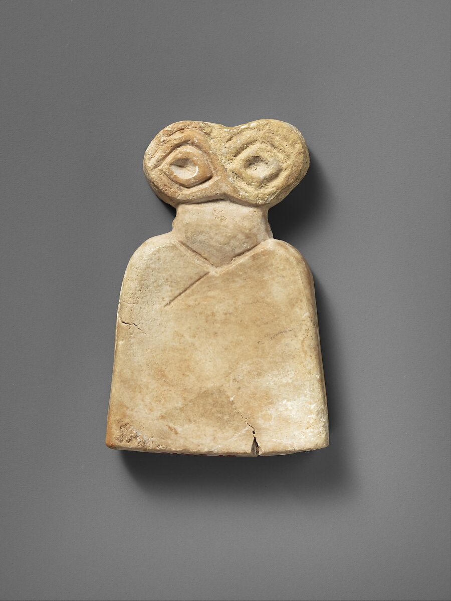 This type of figurine known as an eye idol, made of stone and having incised eyes, has been excavated at Tell Brak, where thousands were found in a building now called the Eye Temple. They were probably dedicated there as offerings. Many are incised with multiple sets of eyes, others with jewelry, and still others with representations of "children"—smaller eyes and body carved on the body of the larger idol. Wide eyes demonstrate attentiveness to the gods in much of Mesopotamian art.