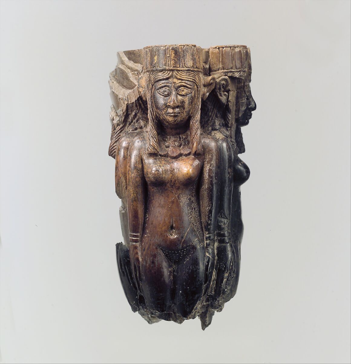 Two ivories carved in the round showing nude and richly adorned female figures were found in the Throne Room of the Burnt Palace at Nimrud. The example in the Metropolitan Museum’s collection, which comprises four back to back figures originally overlaid with gold leaf, was blackened through exposure to fire when the palace was sacked during the final defeat of Assyria at the end of the seventh century B.C. This piece was probably used as the handle of a fan or fly-whisk. A hole drilled into the top suggests that an attachment was originally slotted into it and secured by a dowel. Several elements are characteristic of North Syrian ivories, including the arresting frontal gaze of the nude, elaborately adorned female figures, and their features: large eyes, small mouths, and receding chins. Each figure has an emphasized pubic triangle and wears a polos (a high, cylindrical crown), a choker-style necklace with pendants, and two bracelets on each wrist.