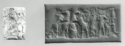 - Title: Cylinder seal and modern impression: bull-man, bearded hero, and lion contest frieze