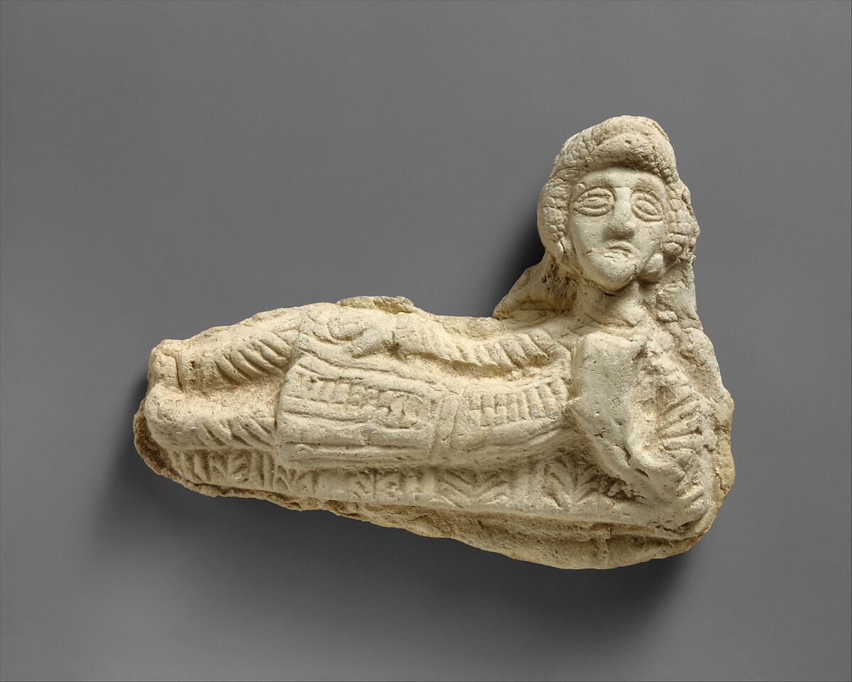 This terracotta plaque features a figure reclining on a couch covered with a herringbone and stripe pattern. Identifiable as male due to his clothing, trousers and a belted, knee-length tunic, he is beardless, wears disk-shaped earrings and holds a cup in his left hand. His torso is angled so that the whole figure is seen from the front. Only a few other terracotta examples of figures in Parthian clothing exist, such as riders on horseback, soldiers, and musicians. Greek terracottas often feature reclining figures, usually males. The use of the pose among ancient Near Eastern plaques and figurines may indicate ties to Greek terracotta manufacturing centers along the eastern Mediterranean coast, although they typically depict females.