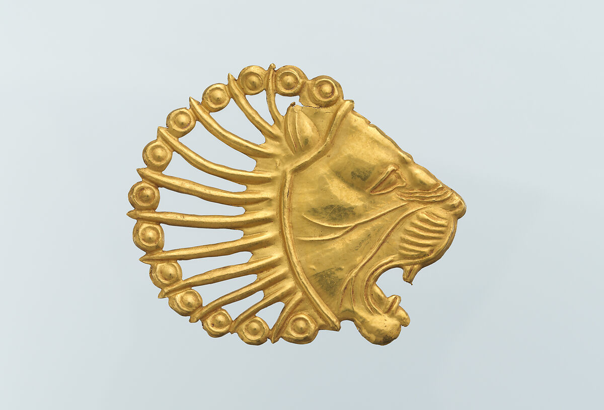 This gold applique is in the form of a lion’s head, facing to the right with its mouth open in a roar. The eye is shown in profile with the lid outlined. Its snout is indicated by a series of raised horizontal lines between the nose and the mouth and above the nose, and two forked whiskers are shown on the cheek. The mouth has two canine teeth, one in the upper jaw and one in the lower, both with a vertical groove. The lion’s tongue is visible behind the lower tooth, and the lips are rendered with two thick lines around the edge of the mouth. The face is separated from the mane by a thick, raised line. Above the line is a pointed ear with two vertical grooves. The openwork mane consists of eleven thick lines radiating from the back of the lion’s head, interspersed with raised dots. The back side of the applique has five rings for attaching it to fabric.