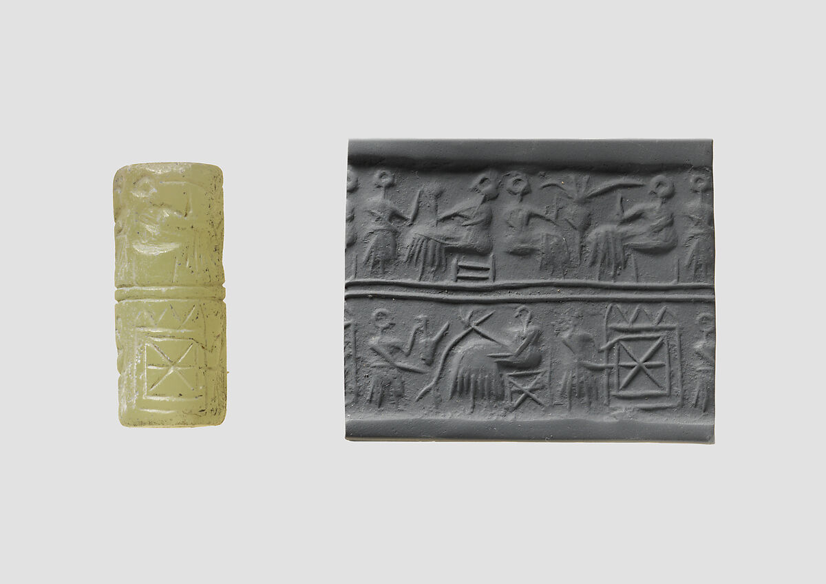 - Title: Cylinder seal and modern impression: banquet scene with seated figures drinking a liquid through straws
