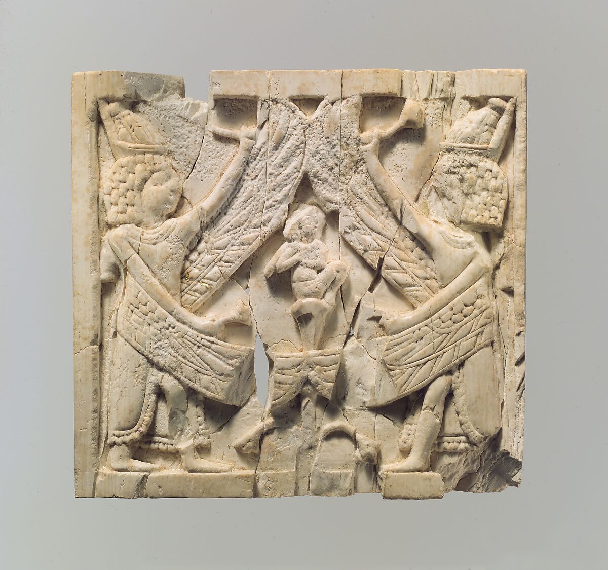 - Title: Furniture plaque carved in relief showing two winged, male figures flanking an infant on a lotus flower