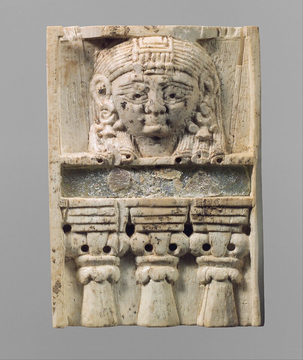 This plaque is carved in two registers divided by a rectangular band of iridescent glass inlay. It is one of several examples of the “woman at the window” theme from Arslan Tash in which the head of an elaborately adorned female set inside a raised frame looks out toward the viewer from behind a balustrade of columns with volute capitals. The plaque can be attributed to the South Syrian style. Certain details are of Egyptian derivation including the woman’s long curls and originally inlaid, delicately incised eyebrows and eyes, while the large ears, laden with heavy, cruciform earrings, the small mouth and receding chin are characteristic of North Syrian forms. The woman wears a rectangular fringed diadem with pendant tassels or pomegranates. A diadem of this type was found in the grave of one of the royal women in the Neo-Assyrian capital of Nimrud. It is made of gold, and inlaid with lapis lazuli and colored stones. Some scholars associate the “woman in the window” with the Levantine goddess Astarte.