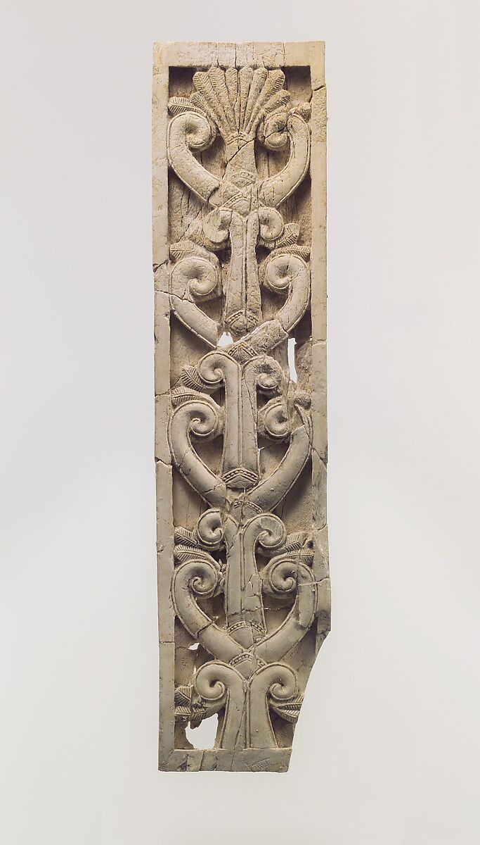 The panel is decorated with four stylized trees, each combining a trunk made up of symmetrical volute stalks below a pair of curling voluted branches. Palm fronds extend from the volutes. A palmette sprouts from the top of the uppermost tree. This panel, and others like it found in the same storeroom, seem to have been used together with the ivory panels decorated with male and female figures to make up pieces of furniture. Several chair backs whose ivory inlays were still in place were arranged with one voluted palmette tree plaque on each outer edge, and four figural plaques in the center, making a total of six plaques used to ornament the back support portion of the chair. Only one furniture element in the storeroom had a back decorated entirely with plant forms, a piece that was likely part of a couch or bed, which is also in the Metropolitan Museum’s collection (59.107.1).