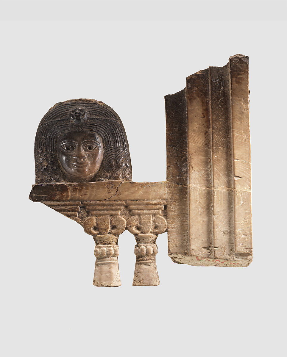 On this fragmentary plaque, four bands nestled inside one another, preserved on one side, frame the head of a female figure who peers out toward the viewer over a balustrade supported by columns with volute capitals. A number of other furniture inlay plaques with this imagery, a motif known as the "woman at the window," have been found in a storeroom at Fort Shalmaneser, a royal building at Nimrud that was probably used to store tribute and booty collected by the Assyrians while on military campaign. This plaque can be attributed to the Phoenician style due to its openwork carving technique. The hair, bound by a thin fillet with a floral element, is parted in the center and falls in ringlets. The drilled pupils suggest that they were originally enlivened with semiprecious stone or glass inlays. There is no conclusive interpretation of whom these plaques were meant to represent; some scholars associate them with the Levantine goddess Astarte. Several other ivory plaques with this imagery found at Arslan Tash in Syria are also in the Metropolitan Museum’s collection (MMA 57.80.11, 57.80.12, and 57.80.13).