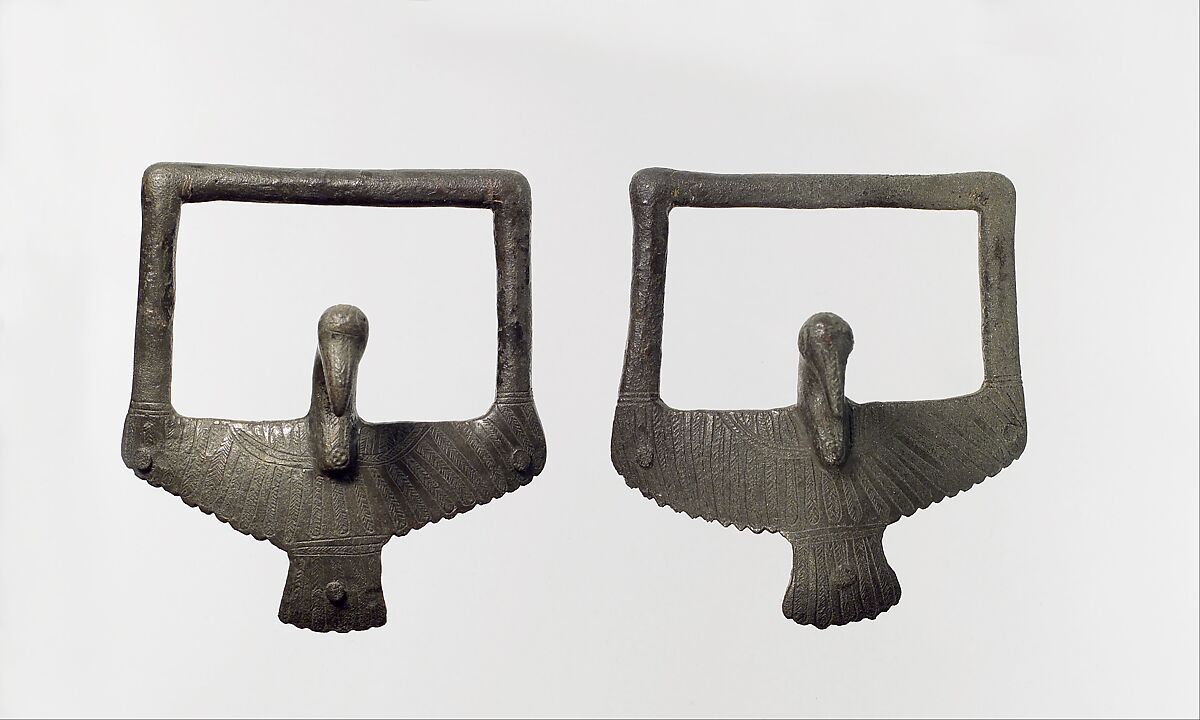 These handles were once fixed, each by three rivets, to a hammered bronze shallow bowl or basin. They are in the form of stylized long-necked birds with outstretched wings and tail; a fixed rectangular handle rises from the wing tips. Each bird head, which faced out from the bowl, projects slightly forward, with a herringbone pattern on the beak and neck, and the eyes etched in simple concentric circles. The wings and tails are decorated by incised herringbone patterns to suggest separate feathers. Such bird-head protome attachments are represented in Near Eastern art in the round on buckets and cauldrons as well as on bowls and basins. They were popular in Assyria and Iran during the ninth and eighth centuries B.C.