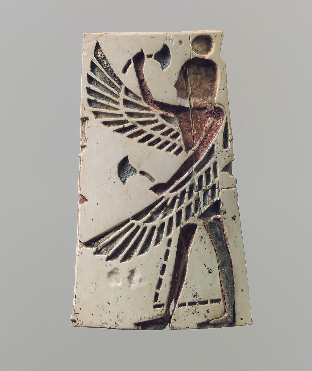 This slightly convex plaque with tapering sides depicts a winged youth holding a papyrus blossom in each hand. It was found in a large storeroom at Fort Shalmaneser, a royal building at Nimrud that was probably used to store tribute and booty collected by the Assyrians while on military campaign. This piece was probably used to decorate a circular cosmetic box or as an inlay for a wooden piece of furniture. It is carved in the champlevé technique, in which recessed spaces cut into the plaque were filled with colored inlays. The red pigment that can be seen in the cells of the body is primarily composed of iron, a red colorant, whereas the pigment preserved in the wings, kilt, and papyrus blossoms is blue. The preserved inlay in the proper left leg, which is made of leaded glass (glass with added lead), is colored blue by the addition of copper. This suggests that the other cells of the body were also inlaid with colored leaded glass and set against a background of red pigment. While there is no way to know the original color of the leaded glass inlays that do not survive in the other cells of the body, it is possible that this figure was intended to be seen as blue outlined in red. Several elements, including the champlevé technique and the skillful carving of the slender figure, are characteristic of Phoenician artistry, as is the Egyptianizing motif of a winged youth crowned by a solar disc holding papyrus blossoms. Carved traces on the edges of the plaque suggest that it was attached to additional plaques on either side which were also decorated with Egyptianizing imagery in the form of papyrus blossoms and a column with a floral capital.