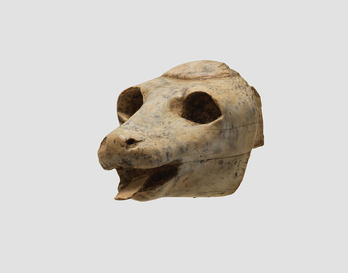 This carved ivory head was found in a storage room in Fort Shalmaneser, a royal building at Nimrud that was used to store booty and tribute collected by the Assyrians while on military campaign. It depicts an animal with a long, narrow snout, mouth open and tongue extended, and large eyes that would have been inlaid with materials in contrasting colors. A tenon at the back of the head would likely have been used to attach the head to the animal’s body, perhaps carved out of another piece of ivory or a different material. Carved ivory pieces such as this were widely used in the production of elite furniture during the early first millennium B.C. They were often inlaid into a wooden frame using joinery techniques and glue, and could be overlaid with gold foil or inlaid to create a dazzling effect of gleaming surfaces and bright colors. The piece may have represented a dog, as the nose resembles that of a canine rather than the broader snout of a sheep or goat, and the deep-set eyes face forward rather than to the sides, indicating the animal was a hunter. Dogs rarely appear in the decoration of the carved ivory furniture and small luxury objects collected by the Assyrian kings. However, dogs are fairly common in the art of ancient Mesopotamia in other contexts, and are shown as a wide range of types, including thick-necked guard dogs wearing collars (see 1989.233 in the Metropolitan’s collection), small dogs with curled tails associated with the healing goddess Gula, and hunting dogs resembling the modern saluki. This ivory head most closely resembles the latter.