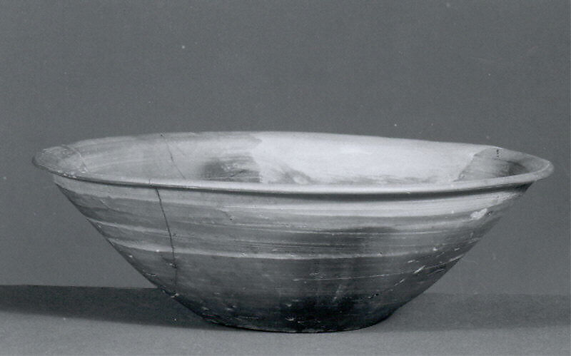 This bowl has a flat base, gently sloping sides and an outturned rim. It is made of a red clay with mottled smoke patterns on the interior and exterior, an accidental side effect of the firing process. It was excavated at Yarim Tepe in northeastern Iran, six miles south of the modern town of Gonbad-e Kavus. Yarim Tepe was a small settlement, inhabited from the Neolithic to the Parthian period, with many interruptions. Bowls with similar shapes were discovered at Shahr-i Qumis in northern Iran, believed to be the site of the Parthian capital Hecatompylos.