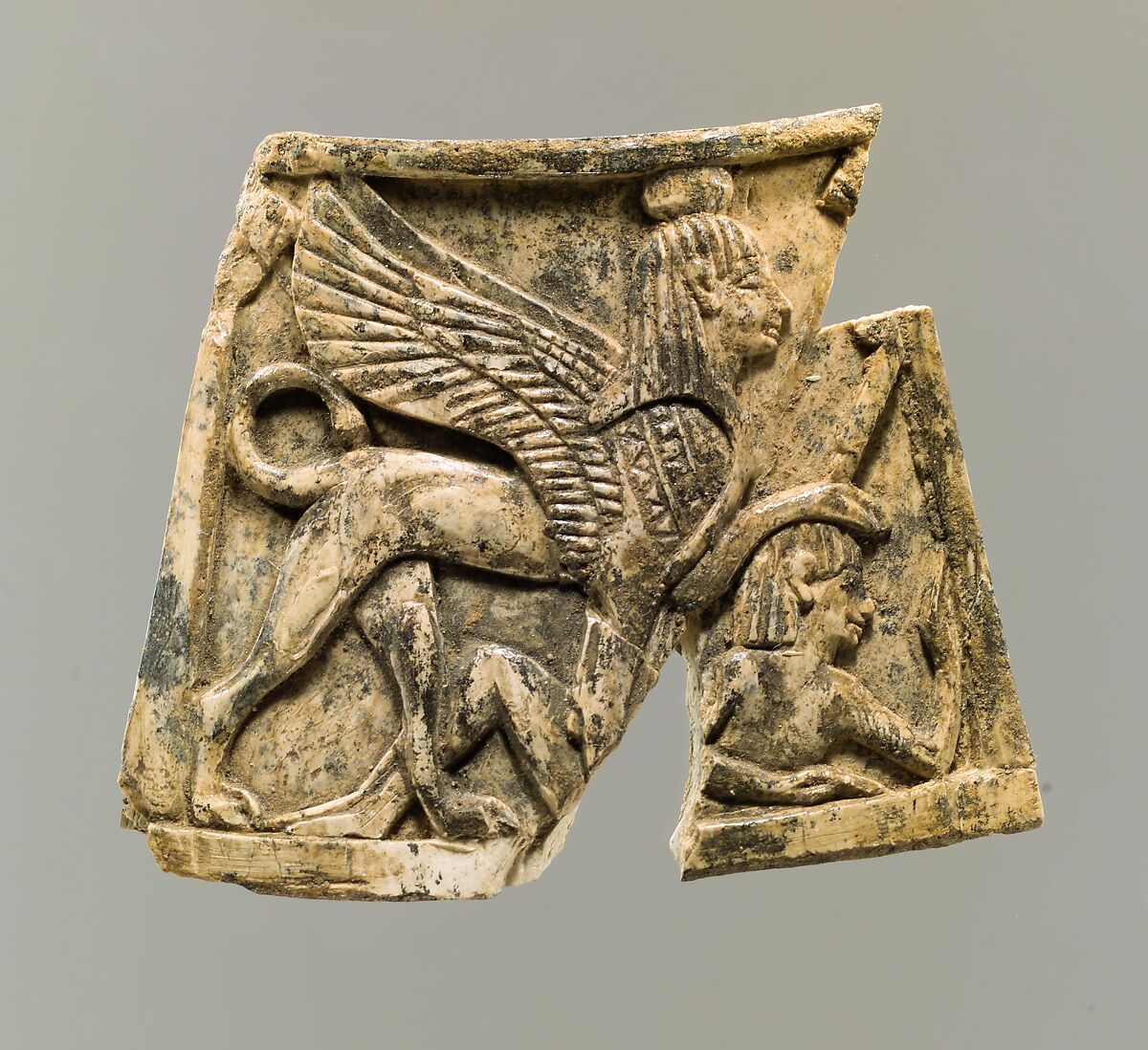 This curved, trapezoidal ivory plaque was found in a storage room in Fort Shalmaneser, a royal building at Nimrud that was used to store booty and tribute collected by the Assyrians while on military campaign. It depicts a human-headed winged sphinx walking to the right, trampling a collapsing figure who seems to be nude, and who raises his head to face right while lifting his left arm, palm facing outward. Three of the sphinx’s legs are those of a lion, as is typical, while unusually the left front appears to be a human arm; the sphinx places its human hand atop of head of the collapsed figure it tramples. The sphinx wears an Egyptian-style wig and broad collar necklace, with a headdress in the shape of a compressed disc. Traces of two papyrus plants appear at the left and right edges of the scene, and a raised plain border runs along the top and bottom. Carved ivory pieces such as this were widely used in the production of elite furniture and luxury objects during the early first millennium B.C., and could be overlaid with gold foil or inlaid to create a dazzling effect of gleaming surfaces and bright colors. This piece is one of many elaborately carved ivories with motifs adapted from Egyptian art that have been attributed to Phoenician workshops, as Phoenician art shows strong Egyptian influence. It was found with many other small curved trapezoidal plaques, suggesting that these pieces were originally fitted together to create ring-shaped objects that were wider at the bottom than the top. If equipped with bases and lids, these could have been used as boxes, or alternatively they could have served as stands for bowls or round-bottomed goblets.