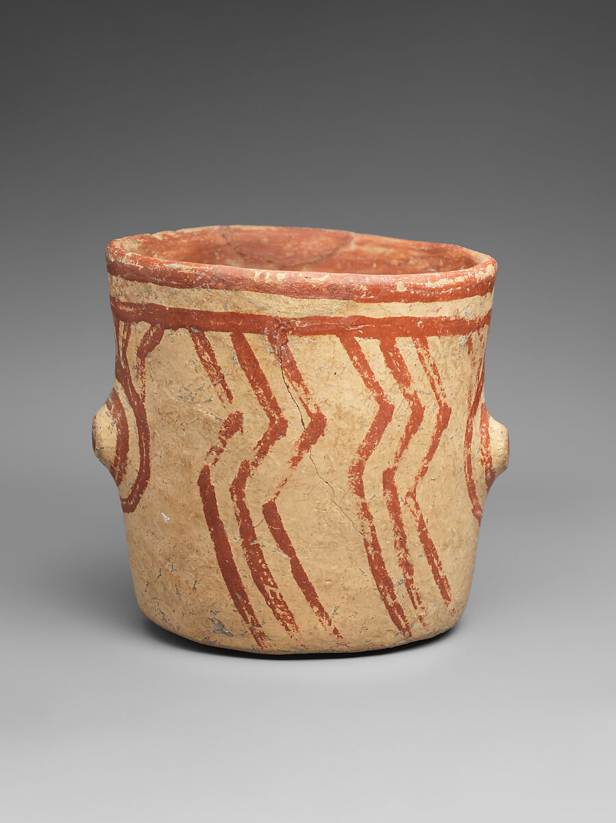The site from which this ceramic vessel comes has not been identified. However, the geometric decorative pattern in red paint on cream slip (a thin coating of special clay) is characteristic of the site of Hacilar in Turkey in the Chalcolithic period. In the previous Neolithic period, the pottery at Hacilar was brown- or red-slipped and then polished with a piece of stone or bone before being placed in the kiln; in the Chalcolithic, lively painted decoration was introduced.