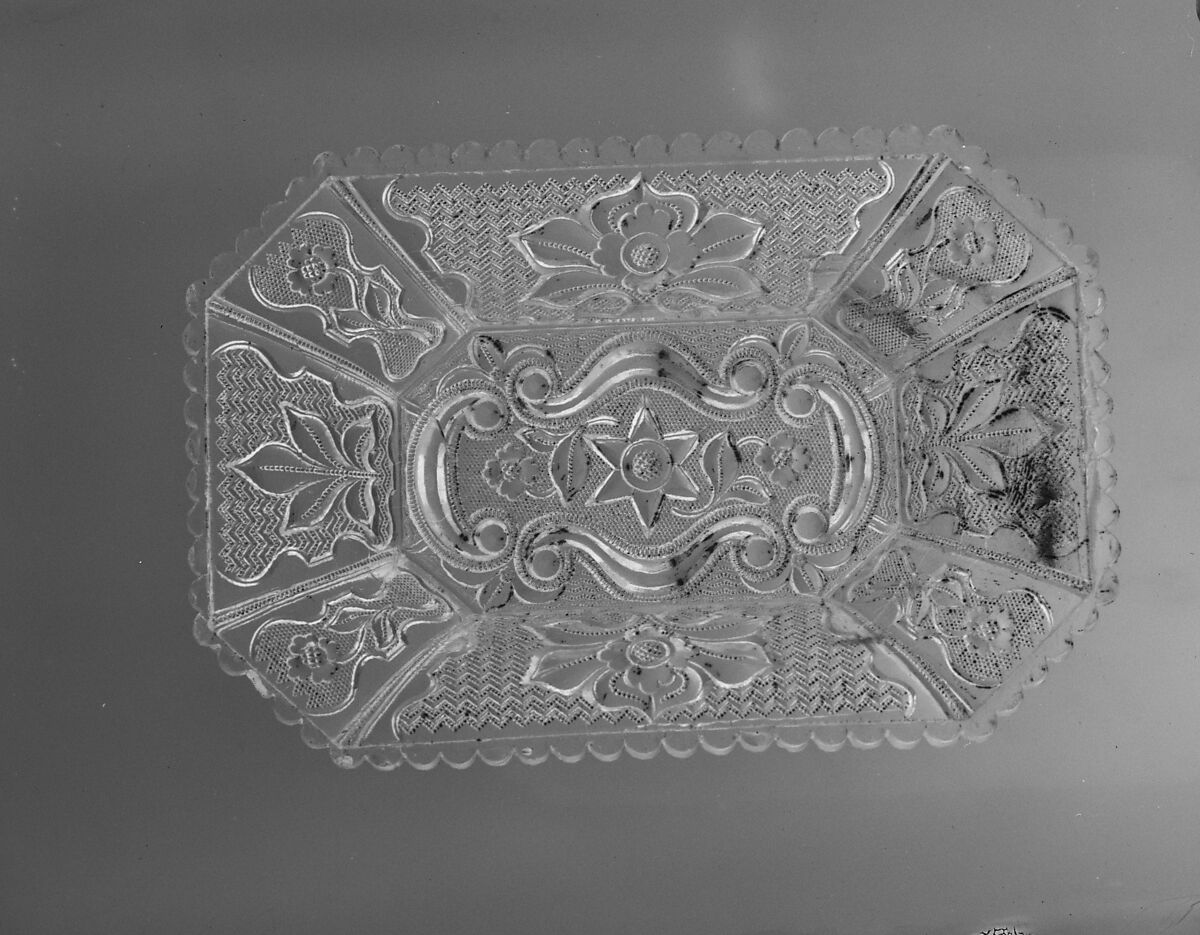 This dish shares the same eight-sided shape and pressed pattern as 51.171.57, but is smaller than its mate. There are table rests on the underside.