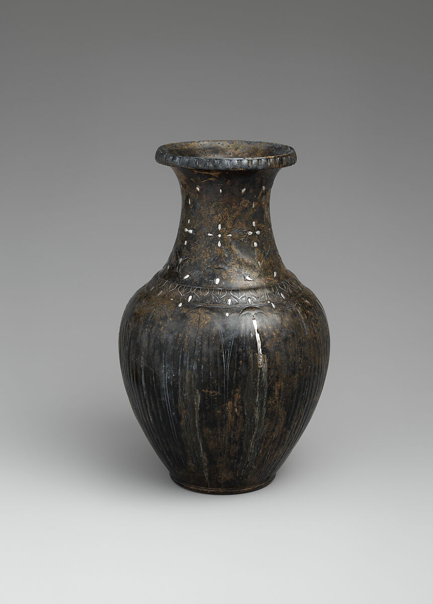 Elaborate bowls and vessels were highly valued in ancient Near Eastern society. During the pre-Achaemenid, Achaemenid, Seleucid and Parthian periods, examples made of bronze, silver, gold, and clay were used throughout a vast area extending both to the east and west of Iran. This elegant bronze cast vessel, reportedly from Iran, is decorated with floral and botanical patterns in relief inlaid with silver. Acanthus leaves and floral motifs appear on the neck; heart-shaped leaves and lily or lotus flowers around the collar. The leaves of a white lotus plant on the body alternate with additional blossoms on the body. The broad petals and vertical ribbing distinguish the leaves of a white lotus from those of a blue one, which is more commonly represented. Silver inlay that originally appeared on the leaves’ central spines, still extant on one of them, would have enhanced the vase’s luxurious appearance even further. Although its place of production is unknown, both the decoration and casting techniques reflect Hellenistic prototypes.