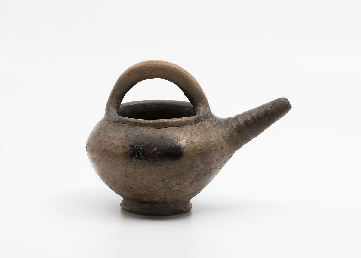 This pitcher was excavated from a grave at Dinkha Tepe in northwestern Iran. During the Iron Age Dinkha Tepe was a small settlement, probably ruled by Hasanlu, a major site fifteen miles to the east. Presumably this pitcher was used to pour a liquid containing dregs, such as wine, since the round body and spout would prevent the dregs from ending up in the cup. However, its small size would have limited its usefulness as a serving vessel. Possibly it was used in a funerary banquet or ritual before it was placed in the grave.