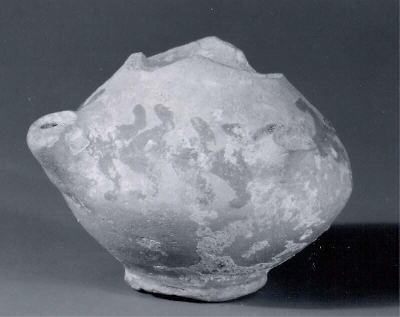 This vessel has a globular body and a ring base. The remains of a spout and a handle are present on the body; the rim is not preserved at all. The vessel is made of buff clay on potter’s wheel, with the handle and spout added later. It is decorated with a vine pattern in red paint. The vessel was excavated at Tepe Nush-i Jan, an Iron Age hilltop site about 60 km sound of Hamadan in western Iran. Nush-i Jan is generally associated with the Medes, an Iranian people known from Assyrian, Achaemenid and Biblical sources. However, the site was evidently reoccupied in the Parthian period, probably between the 1st century B.C. and the 1st century A.D., to period to which this vessel dates.