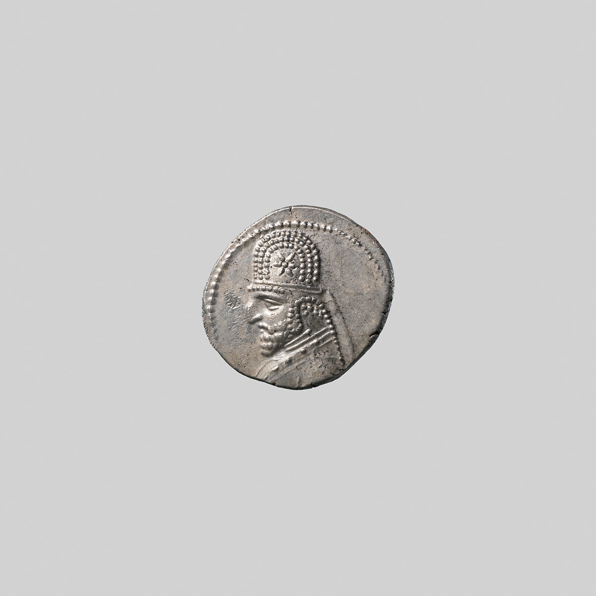 This coin was struck by an unknown Parthian king, probably in the early first century B.C. The king on the obverse is probably meant to be the coin’s issuer, wearing a diadem as a symbol of victory and a tiara, the main type of Parthian royal crown. The identity of the figure on the reverse is unknown; perhaps it is an idealized Parthian king, depicted as an archer.