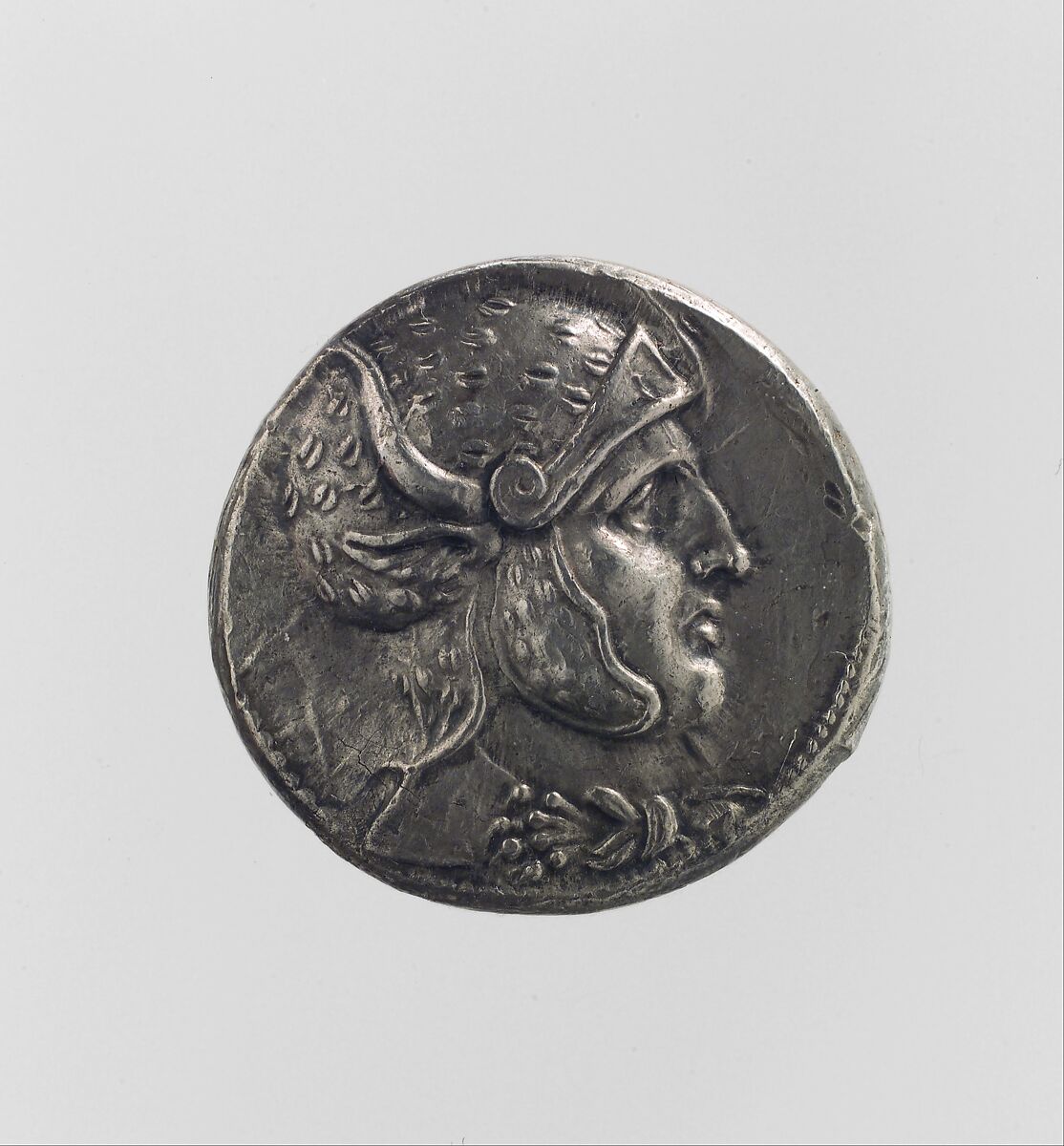 The obverse of this silver tetradrachm coin displays an idealized portrait of Seleucus I (r. 312–280 B.C.) wearing a helmet covered with a leopard skin and adorned with a bull’s ear and horns. Around Seleucus’ throat is another leopard skin, knotted in front by means of the beast’s forepaws. The reverse of the coin has a winged, fully draped figure of Nike (Victory) standing on the right. She holds a wreath in her upraised hands, apparently about to place it upon a trophy of arms comprising a helmet, cuirass with leather straps and skirt, and a star-adorned shield. All the arms are hung upon a large tree trunk, from the lower part of which springs a leafy branch. The inscription reads "Seleucus" and "Basileus" (king).