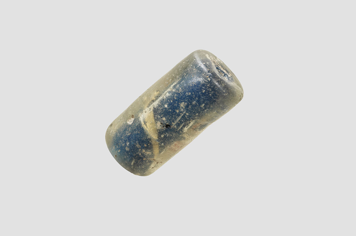 This cylindrical bead is made of glass, streaked with gold foil. It was excavated at Shahr-i Qumis in northern Iran, which has been identified as the ancient city of Hecatompylos, established by the Parthians as their capital by about 200 B.C. In Greek Hecatompylos means ‘a hundred gates,’ suggesting that the city was quite large. Indeed, the modern archaeological site includes several mounds, only a few of which have been excavated, and a vast area covered with potsherds. This bead comes from Site VII, a building which may have originally been an elite residence but which was subsequently reused as a funerary structure.