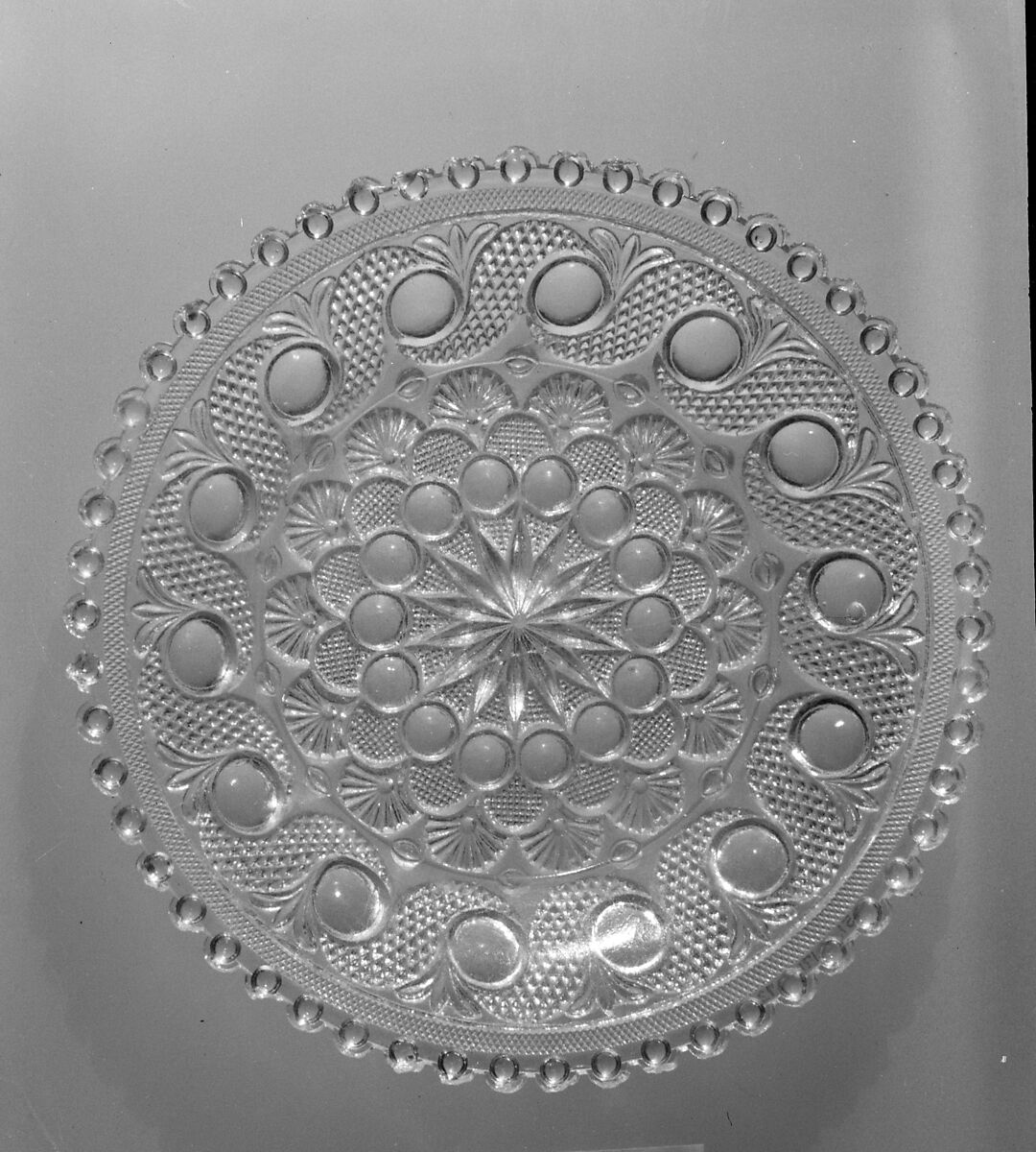 This dish is pressed with a band of scrolled peacock eye pattern. It has bull's eye serrations around the edge.