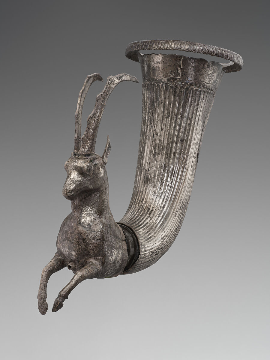 This vessel is called a ‘rhyton’ (from the Greek rheo, meaning ‘flow through’) by scholars because it has a spout at the bottom. Like many rhyta, it consists of a horn-shaped beaker and a hollow sculptural element, in this case in the form of the foreparts of an ibex or wild goat. The beaker has vertical fluting with floral decoration at the top. The rim is folded over and decorated with an egg-and-dart pattern. The goat has extended forelegs, as if galloping. It has a long goatee, a pointed snout, a prominent brow, pointed ears and long curved horns. The pouring spout is on its chest between its legs. The goat’s body was hammered from a single sheet of silver, with the legs, horns and ears attached. The beaker is also hammered.