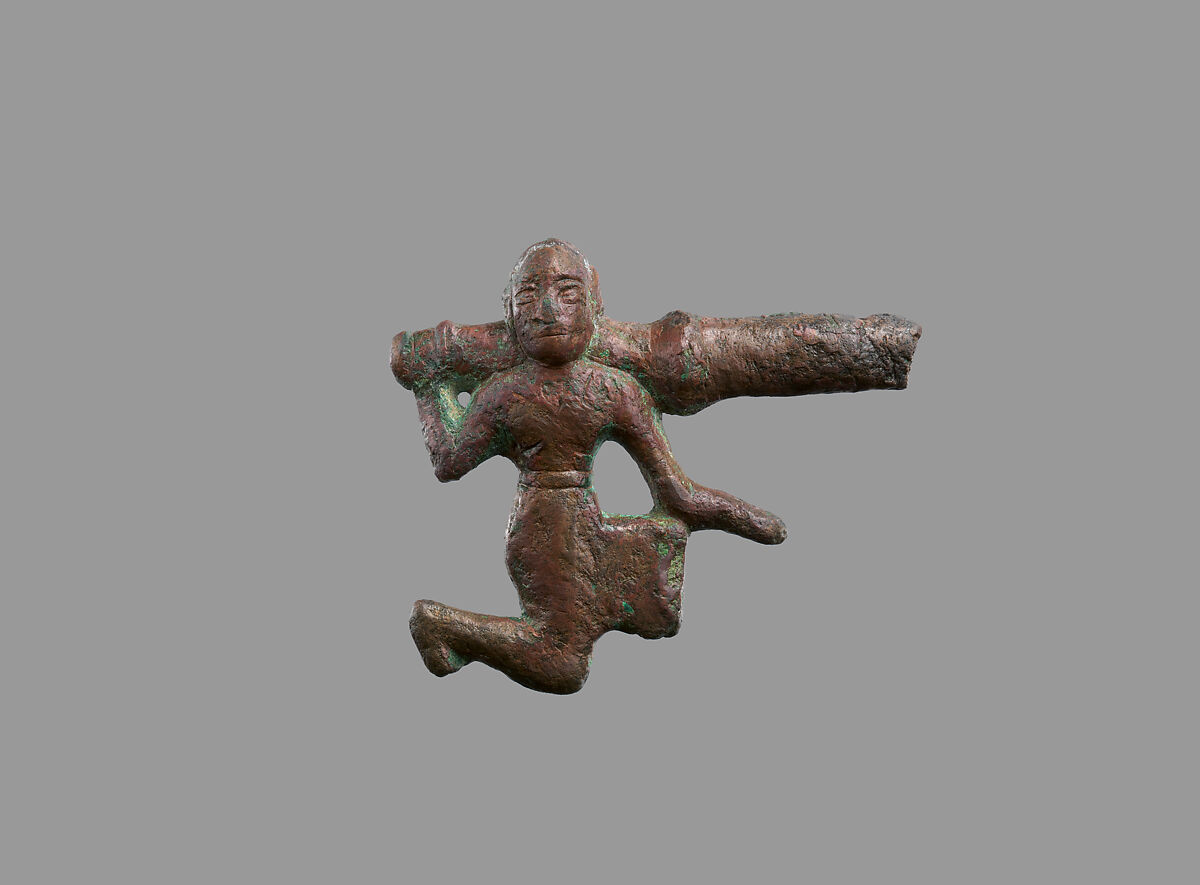 This kneeling male figure would have originally been part of a larger openwork composition. Openwork bronzes are known from the early second millennium B.C. in a variety of forms, but their function in antiquity is not fully understood. Slots and circular openings in the plaques suggest their use with cords, straps, or fabric. The kneeling male seen here – in a belted skirt and clean-shaven – appears on many of the plaques and would have been one of a pair, symmetrically arranged. Clean-shaven individuals in Mesopotamian art are often associated with the temple, where their lack of hair may have been a marker of purity and cleanliness.