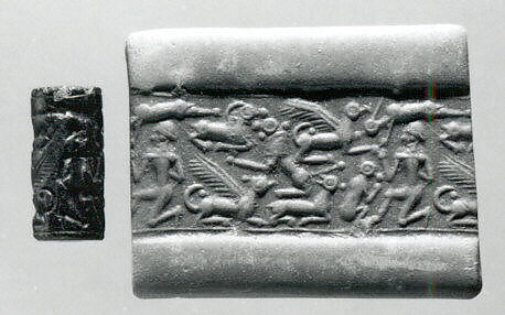 - Title: Cylinder seal and modern impression: nude male, griffins, monkey, lion, goat