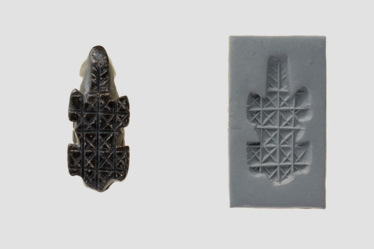 Mesopotamian pendants of the Halaf period are usually of simple, mostly geometric forms. However, this stamp seal appears to represent a hedgehog, an animal that was native to northern Mesopotamia. The stamping surface is decorated with two superimposed grid patterns and a chevron pattern with a central line under the animal's head. Hedgehogs continued to be represented in Mesopotamia for millennia but the animal's symbolic or mythological significance is unknown.