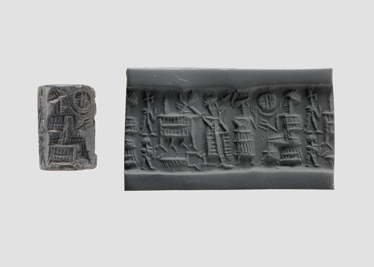 - Title: Cylinder seal and modern impression: seated figure approached by a goddess leading a worshiper