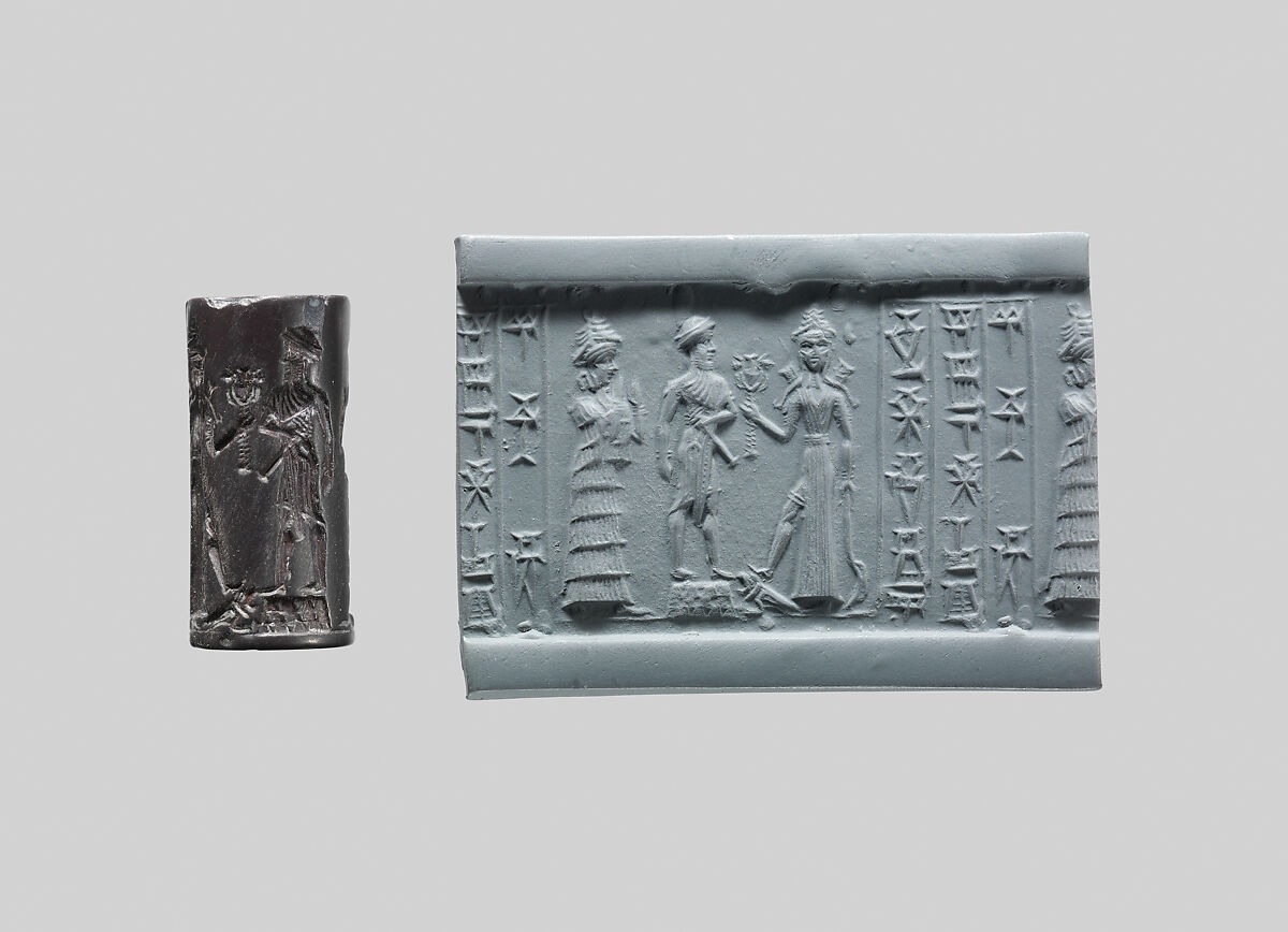 The modern impression of the seal is shown so that the entire design can be seen. This seal features a three line inscription and a scene with the goddess Ishtar, who is shown wearing an open robe and holding a mace in her raised right hand and a scimitar in her left. Weapons emerge from her shoulders and she stands on a lion-headed eagle. Facing her is a man with a mace standing on a platform and behind him stands a suppliant goddess. Presentation scenes – featuring a worshipper before a deity or ruler – were common motifs on seals of the Old Babylonian period. The use of hematite, a dark colored hard stone, is another characteristic of seal production in this period.
